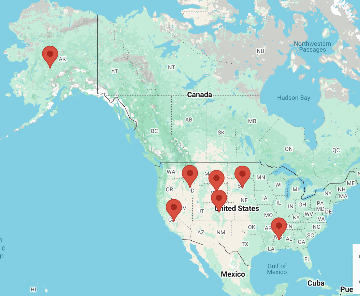 California, Idaho, Mississippi, South Dakota, Wyoming (except Cheyenne), and Alaska (excluding Anchorage and Fairbanks).